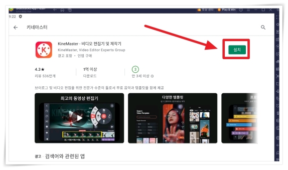 4. 로그인 후 키네마스터를 검색해 "설치"를 클릭해 주세요.