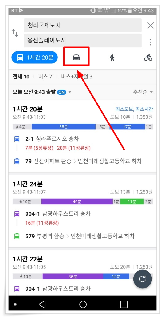 ▼ 상단 버스, 자동차, 도보, 자전거 중에 "자동차"을 클릭해 주세요.