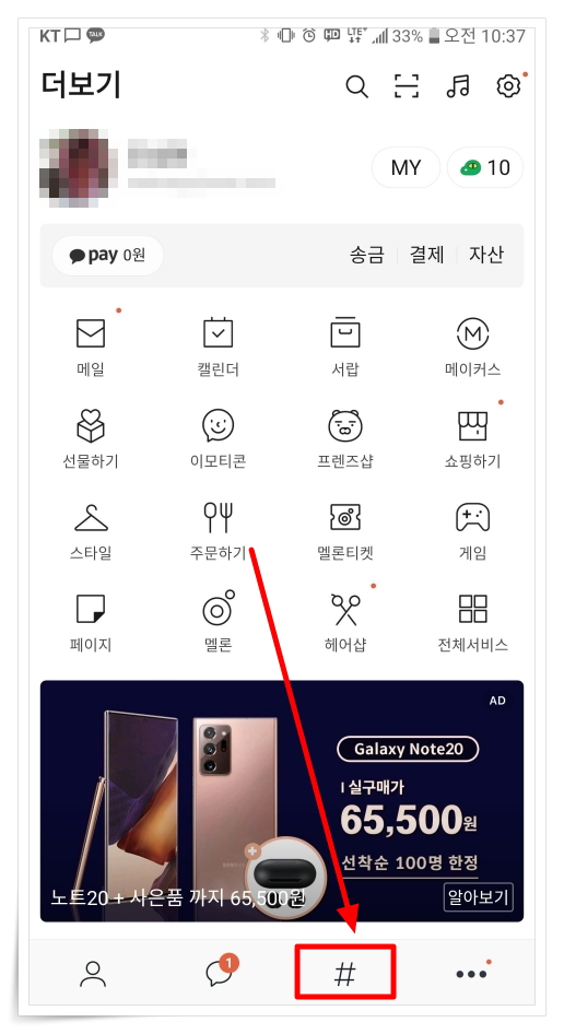 ▼ 카톡 앱 실행 후 하단 "#" 메뉴를 클릭해 주세요.