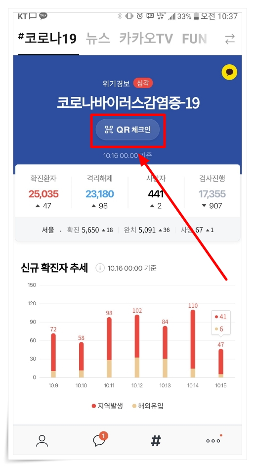 ▼ 코로나19 탭 중앙에 있는 "QR체크인"을 클릭해 주세요.