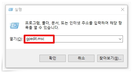 1. 단축키 "윈도우키 + R" 클릭 후 실행창에 "gpedit.msc"을 입력해 주세요.
