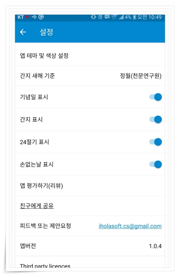 ▼ 앱 테마, 24절기, 간지, 기념일 등 원하는 정보만 표시할 수 있습니다.