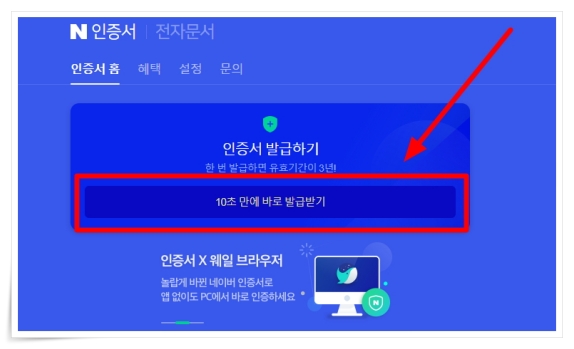 PC에 발급받으려면 먼저 네이버 페이에 가입된 상태에서 진행하셔야 합니다. 그리고 일반 브라우저에는 사용할 수 없고 네이버에서 만든 웨일 브라우저 설치 후 발급받으실 수 있어요.