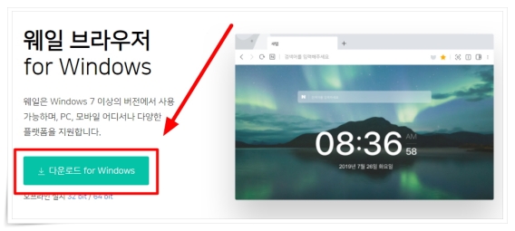 ▼ 인증서를 PC에 발급받으려면 먼저 웨일 브라우저를 설치해야 합니다. 홈페이지에서 "다운로드 for Windows"을 클릭하여 설치해 주세요. (바로가기)