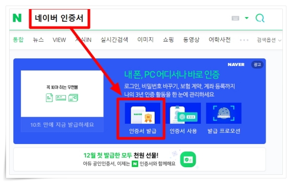 ▼ 네이버 검색창에 "네이버 인증서" 검색 후 "인증서 발급"을 클릭해 주세요.