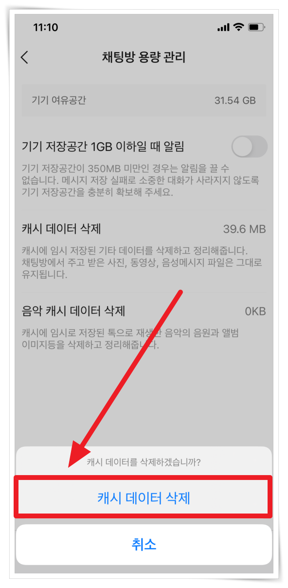 ▼ 캐시 데이터는 채팅방에서 주고 받은 사진, 동영상, 음성메시지 파일을 말합니다. 중요한 데이터는 미리 저장해 두시고 "캐시 데이터 삭제"을 클릭해 주세요.