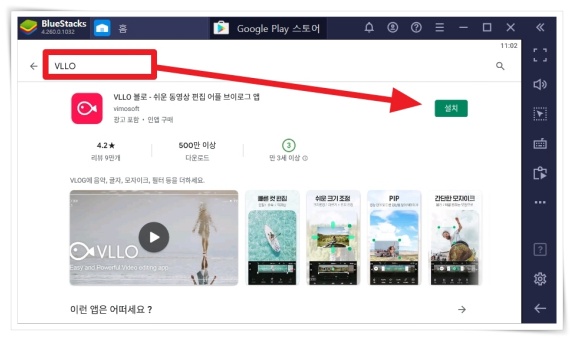 3. 구글플레이 검색창에 "VLLO"을 검색 후 "설치"을 클릭해 주세요.