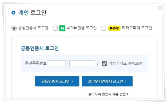 3. 공동인증서, 네이버인증, 카카오페이 중 선택해서 로그인해 주세요.