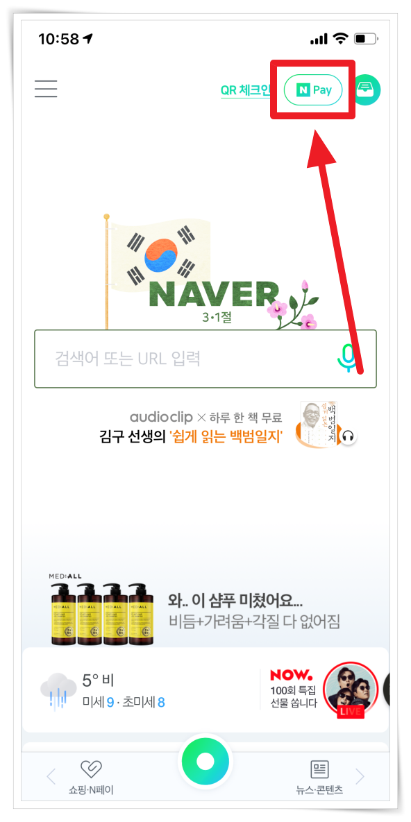 1. 네이버 앱 실행 후 우측 상단 "NPAY"을 클릭해 주세요.