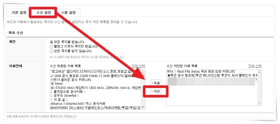 ▼ 수신설정 탭에서 카페전체 "차단"을 클릭하면 한방에 문제를 해결하실 수 있습니다.