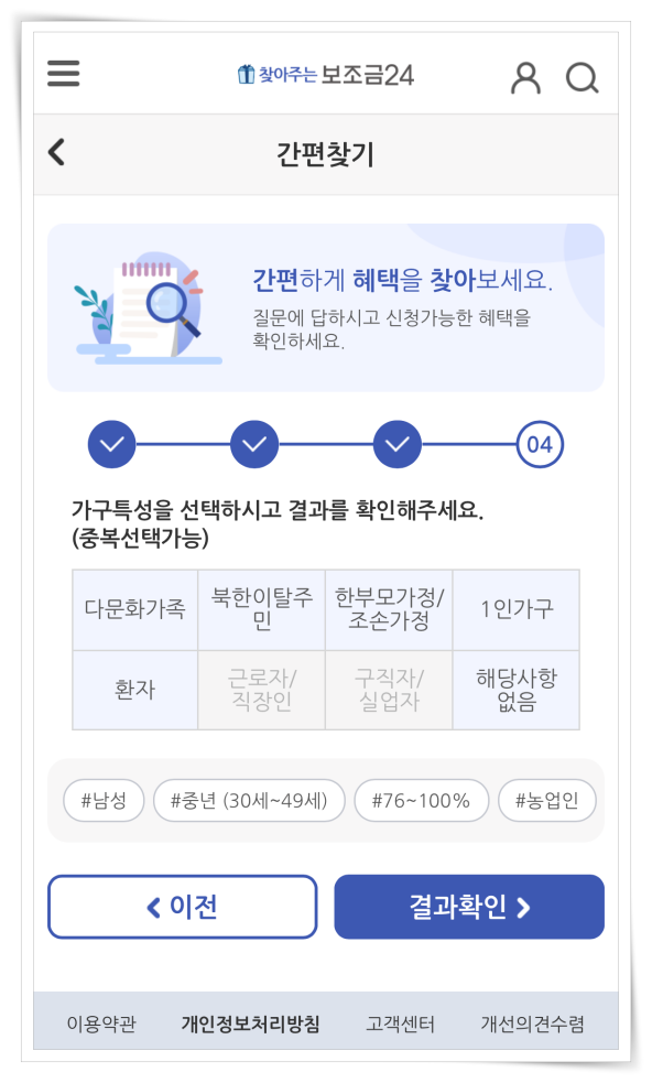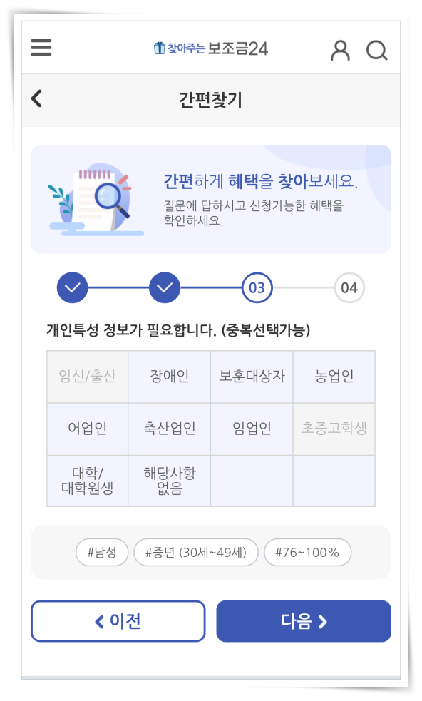 ▼ 중간에 있는 "간편하게 혜택 찾기" 클릭 후 성별을 선택해 주세요.
