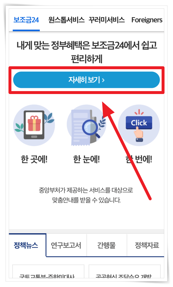 ▼ 앱 설치 후 "보조금24" 메뉴에서 "자세히 보기"를 클릭해 주세요.
