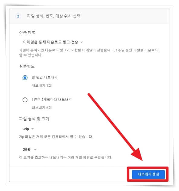 3. 파일 형식, 빈도, 대상 위치 선택에서 "한 번만 내보내기" 체크 후 "내보내기 생성"을 클릭해 주세요.