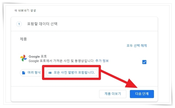 2. "모든 사진 앨범이 포함됩니다"를 클릭하면 원하는 사진을 선택하실 수 있습니다. 사진 선택 후 "다음 단계"를 클릭해 주세요.