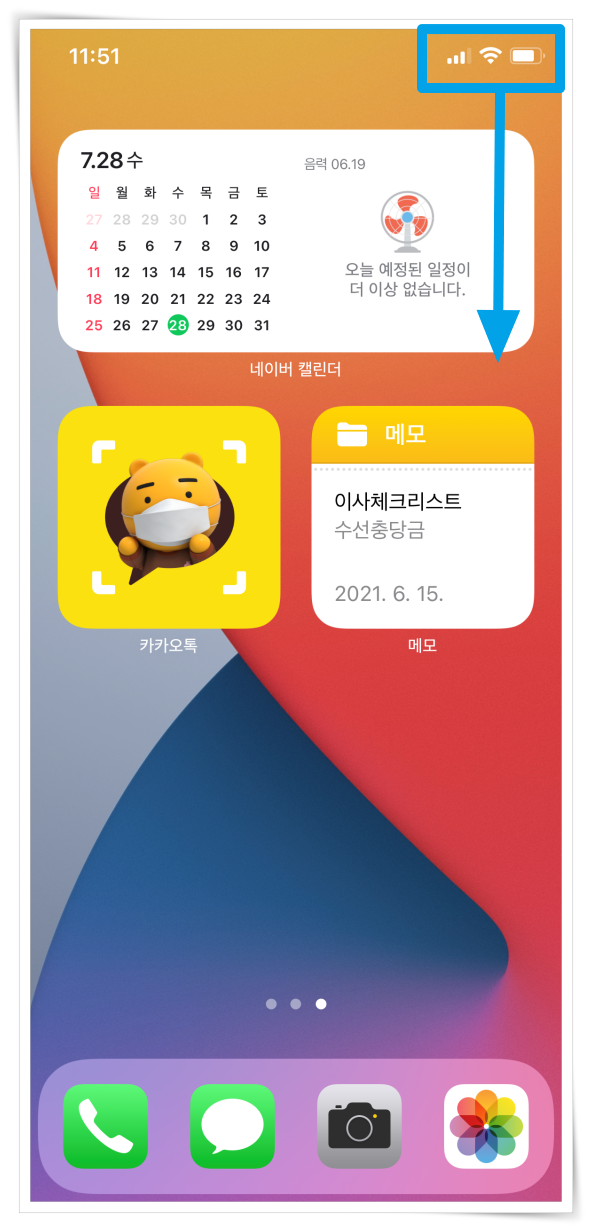 1. 가장 쉽게 볼 수 있는 방법은 우측 배터리, 와이파이 표시 부분을 손가락으로 끌어 내려 주세요.
