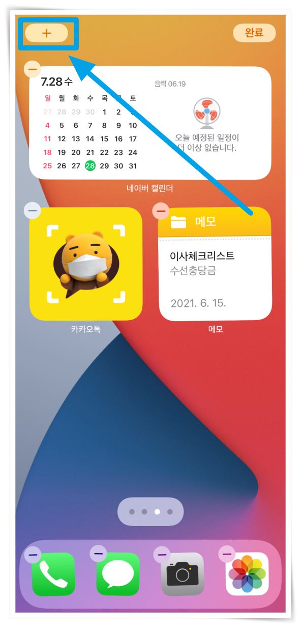 3. 배경화면 빈 곳을 꾹 누르고 좌측 상단 + 버튼을 클릭해 주세요.