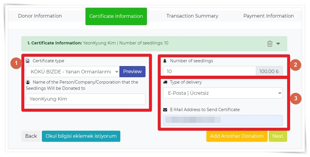 2. 두번째 페이지 ①은 기부증서 타입입니다. Preview를 클릭하여 원하는 디자인을 선택해 주세요. ②는 기부할 나무의 숫자입니다. ③은 E-POSTA 선택 후 이메일 주소를 입력해 주세요.