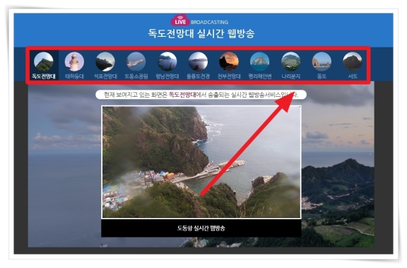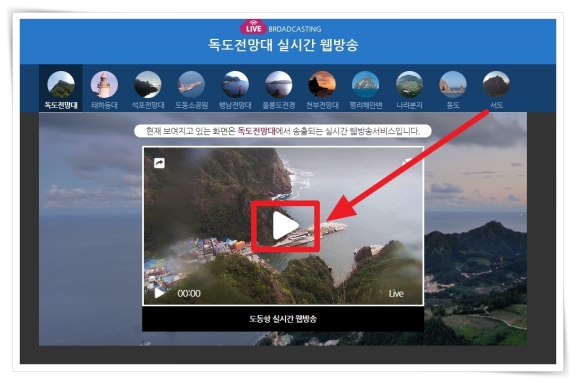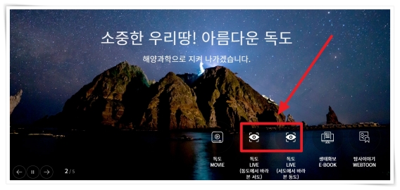 1. 홈페이지 중단에 "독도 LIVE"를 클릭해 주세요. (바로가기)