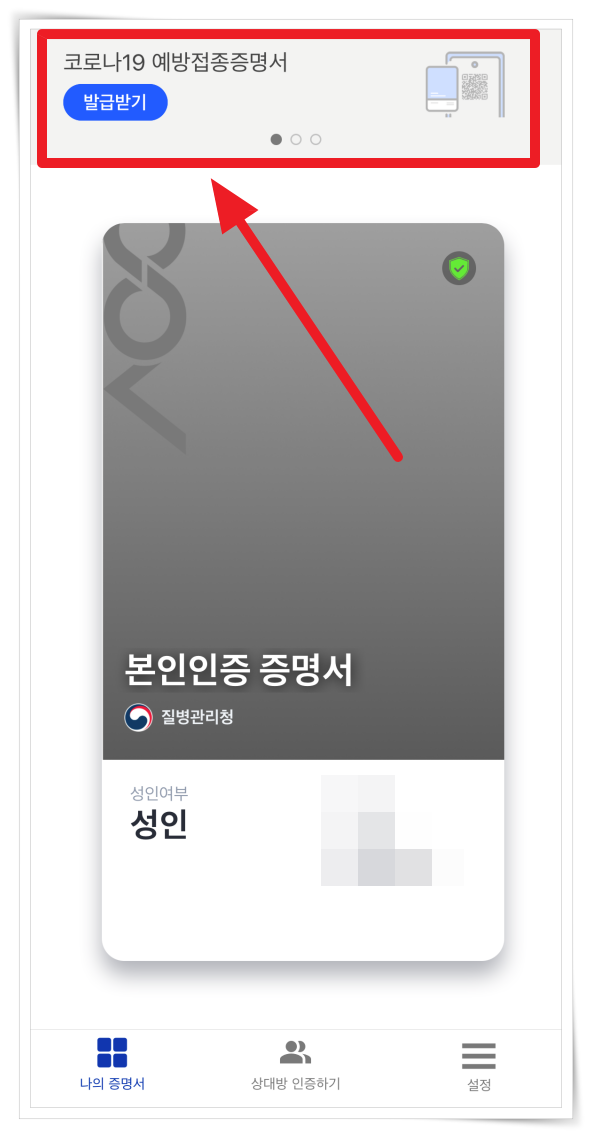 5. 본인인증 후 상단 "코로나19 예방접종증명서" 발급받기를 클릭하면 접종 확인을 하실 수 있습니다.