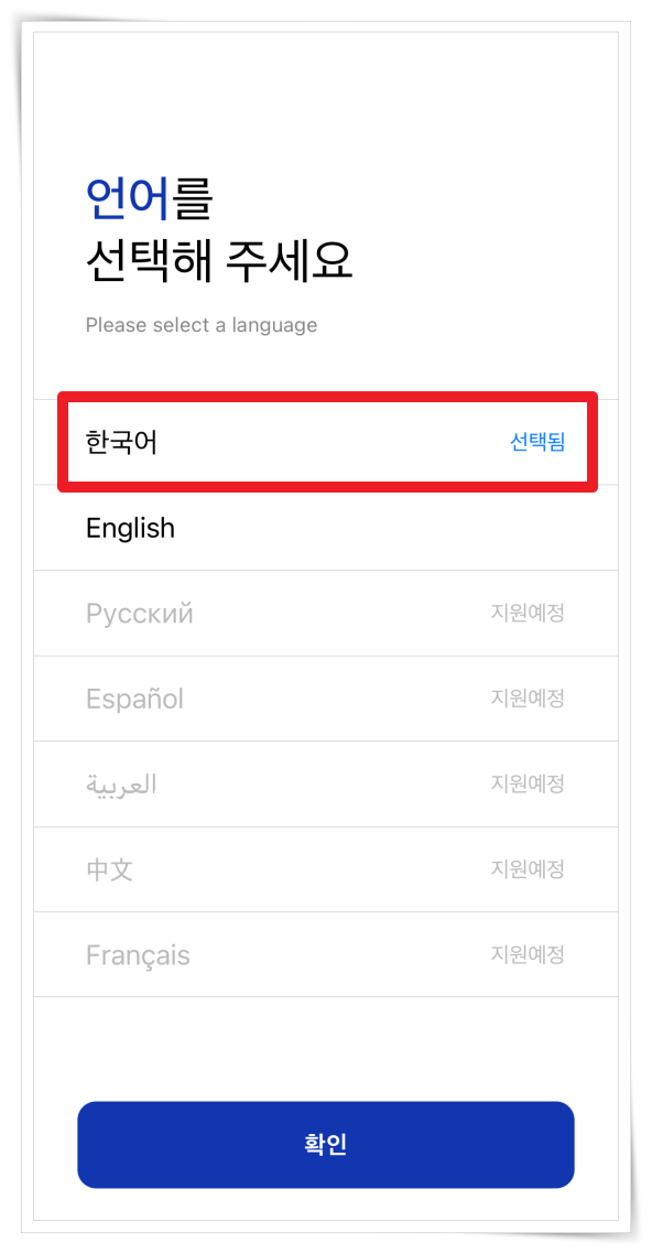 1. 앱 실행 후 언어 및 국가, 지역을 선택해 주세요.