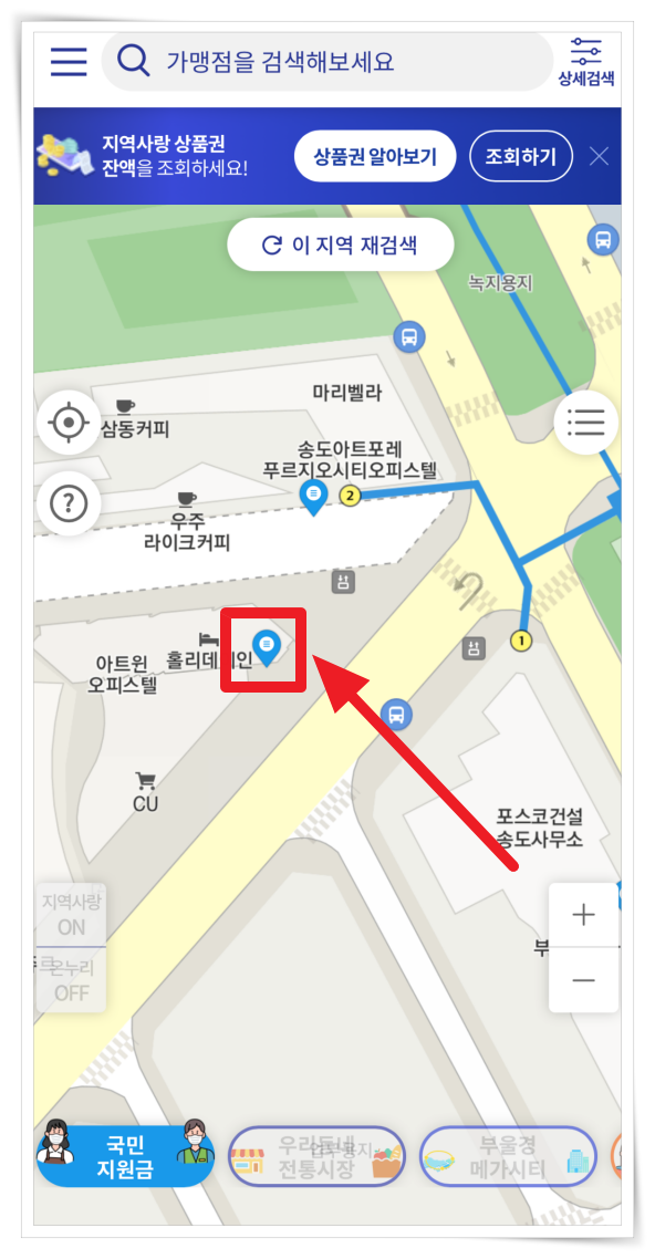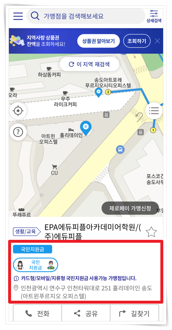 4. 지도에서 파란색 표식을 찾아 클릭하면 지원금 사용여부와 주소, 연락처를 확인할 수 있습니다.