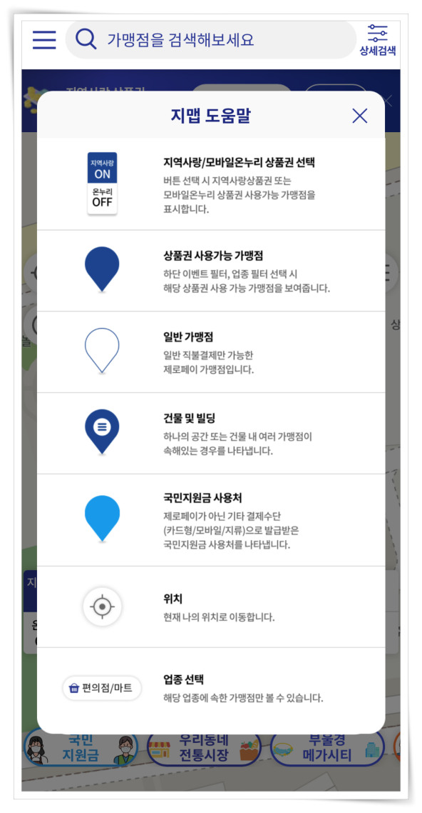 3. 지맵 도움말을 보면 국민지원금 표식을 확인하실 수 있어요. 지도 하단에 있는 "국민 지원금"을 체크해 주세요.