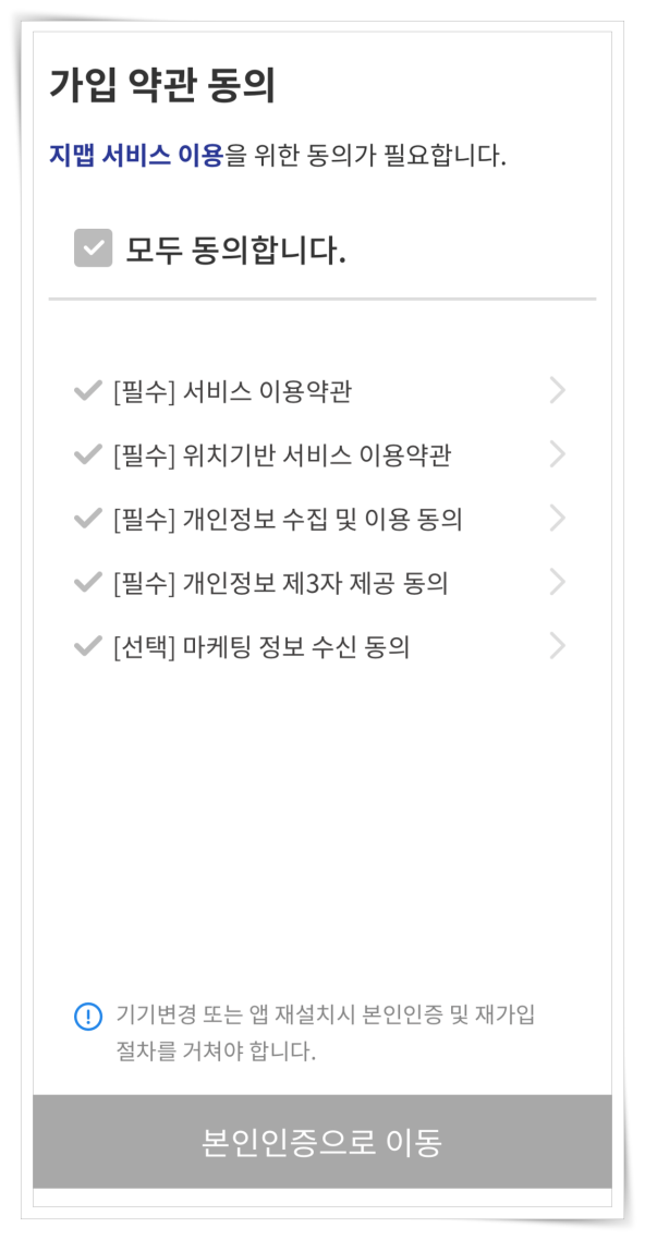 1. 앱 설치 후 가입 약관 동의를 해주세요.
