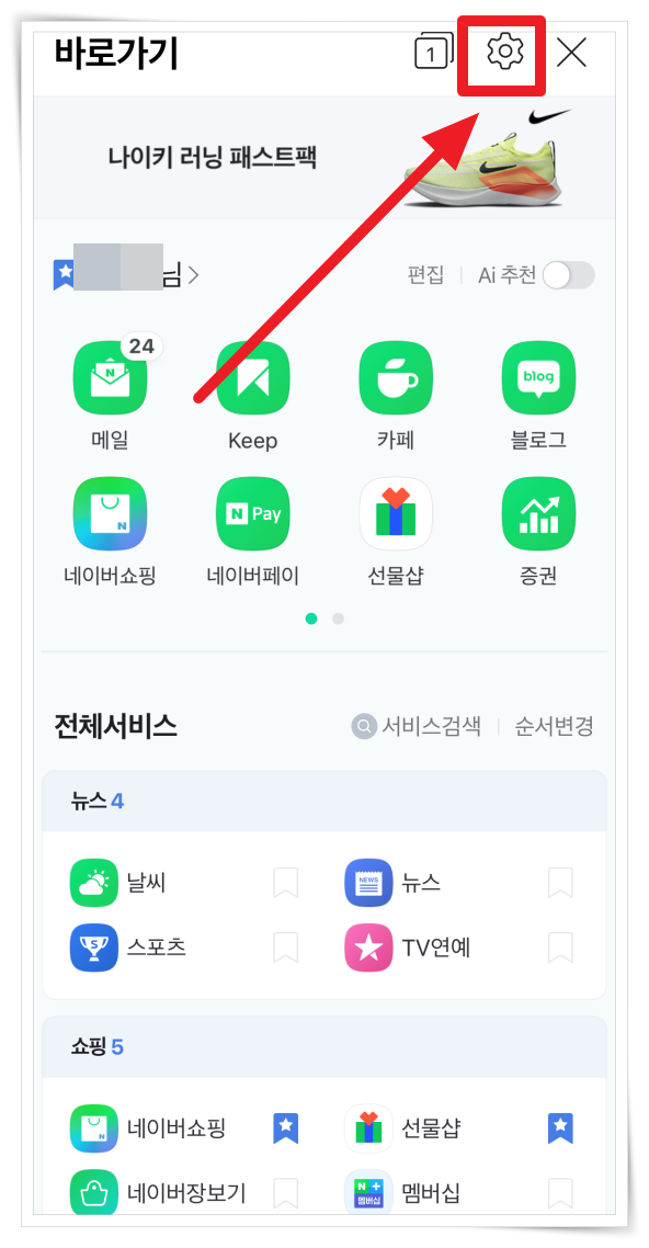 2. 메뉴 우측 상단 "설정" 아이콘을 클릭해 주세요.