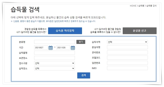 2. 습득물 건색에서 보관장소, 습득물명, 습득지역 등의 정보로 검색해 주세요.