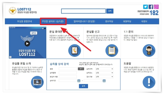 1. LOST112는 경찰청 유실물 통합 포털입니다. 전국 유실물에 관련된 정보가 모여있습니다. 상단 메뉴에서 "주인을 찾아요"을 클릭해 주세요.