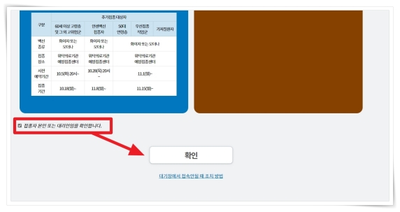 1. 사전예약 홈페이지에서 "접종자 본인 또는 대리인임을 확인합니다." 체크 후 "확인을 클릭해 주세요.