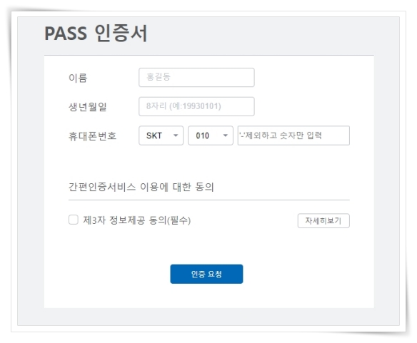 3. 대표적으로 PASS는 이름, 생년월일, 휴대폰번호 입력 후 "인증 요청"을 클릭하면 앱에서 비밀번호를 입력하여 인증하실 수 있습니다.
