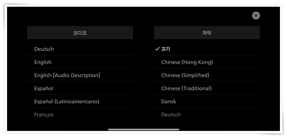 2. 그러면 오디오, 자막의 언어를 선택하거나 활성화 시킬 수 있습니다.