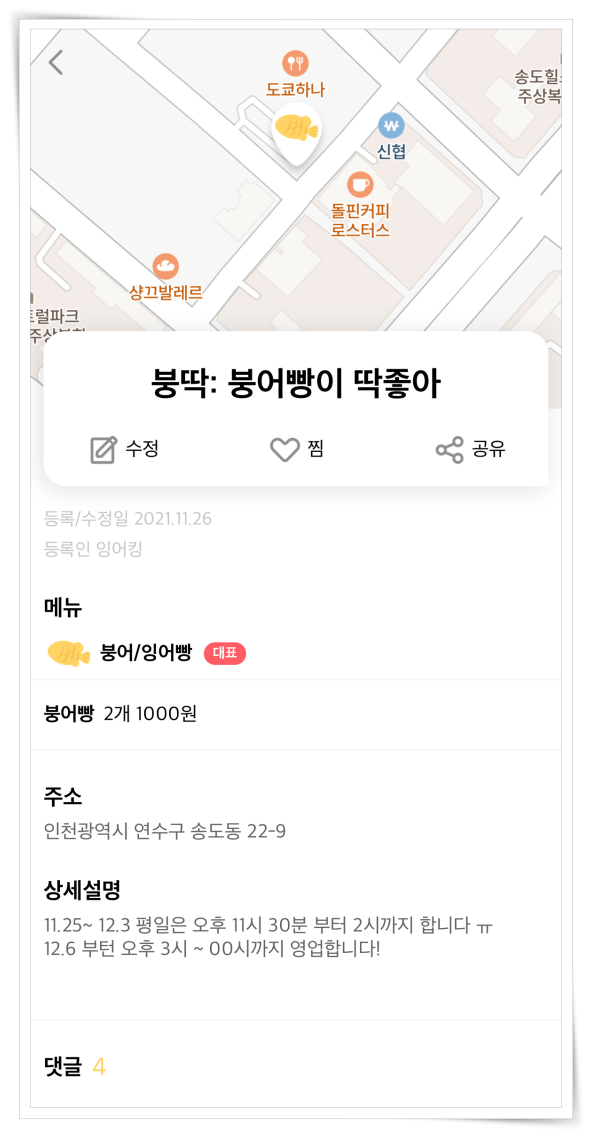 붕어빵은 대부분 노점상 형태로 길거리에서 음식을 팔다 보니 일반 음식점처럼 지도 검색이 어렵습니다. 이럴 때 앱을 이용하면 자신의 현재 위치에서 가장 가까운 길거리 간식 판매처를 확인할 수 있어요. 붕어빵뿐만 아니라 국화빵, 도너츠, 호떡, 순대 등 다양한 길거리 음식을 알아볼 수 있습니다.