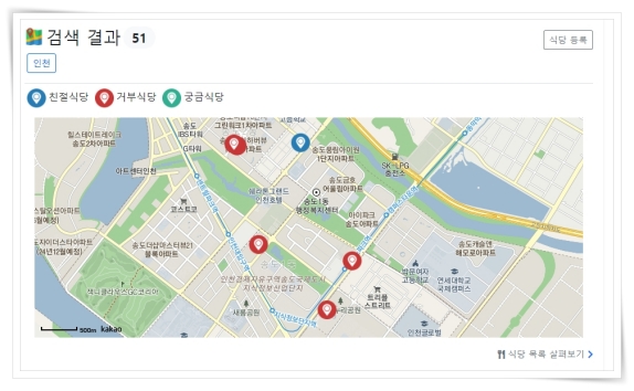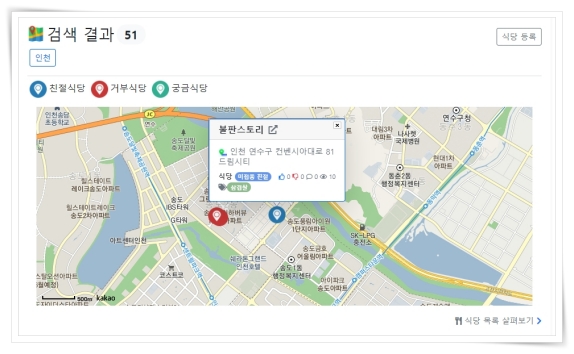 2. 검색결과를 보면 지도에 친절식당, 거부식당, 궁금식당이 표기됩니다. 관심있는 식당을 클릭해 보세요.