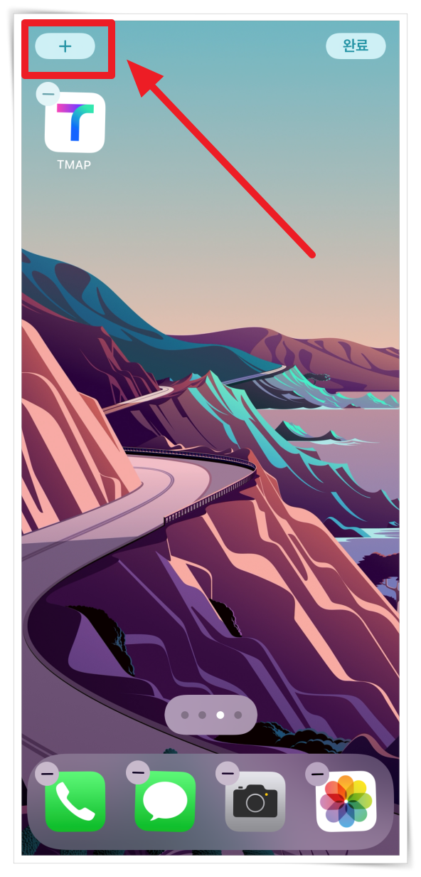 1. 핸드폰 바탕화면 빈자리를 꾹 눌러서 좌측 상단 + 버튼을 클릭해 주세요.