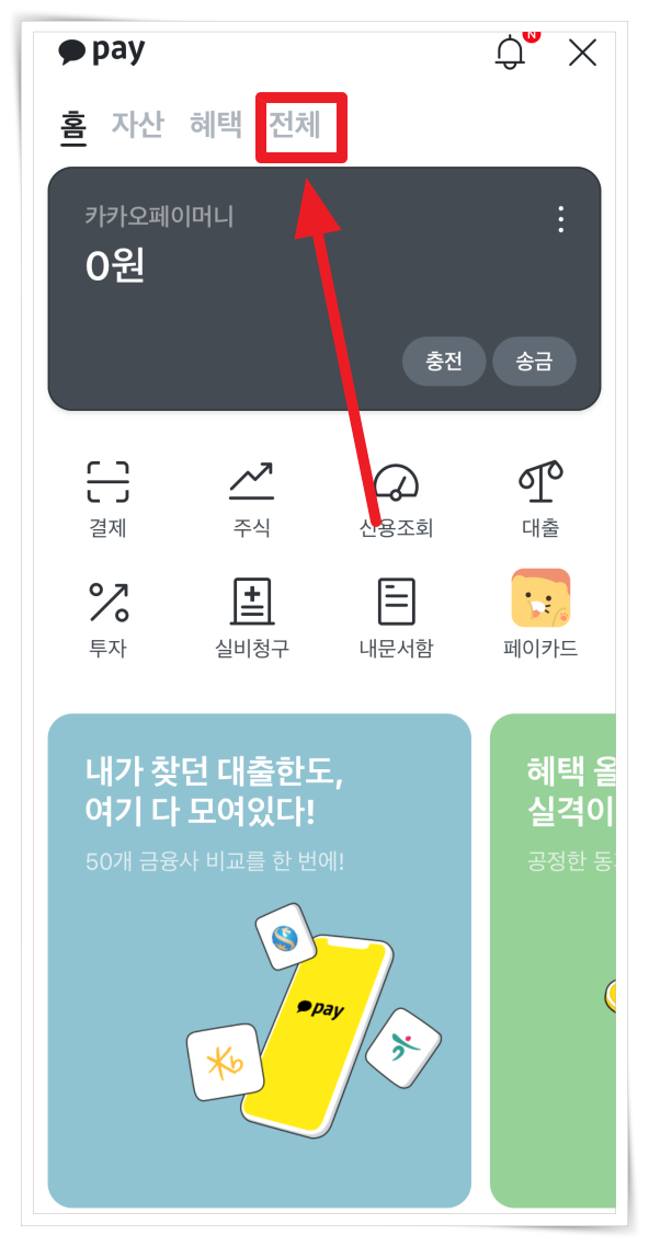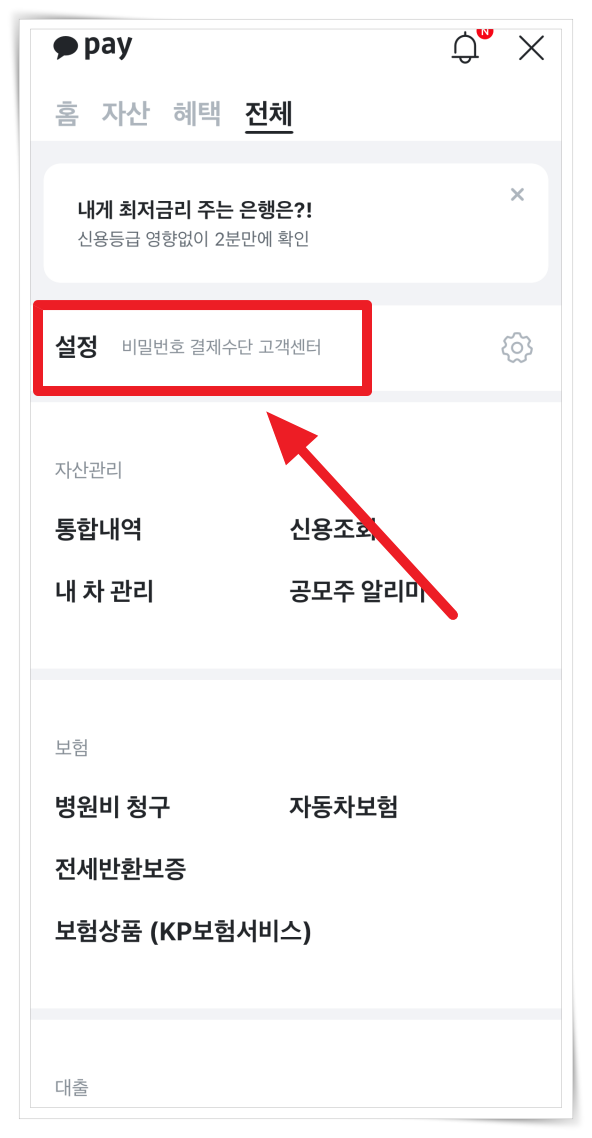 2. PAY 상단 메뉴에서 "전체"를 클릭해서 "설정"으로 들어가 주세요.