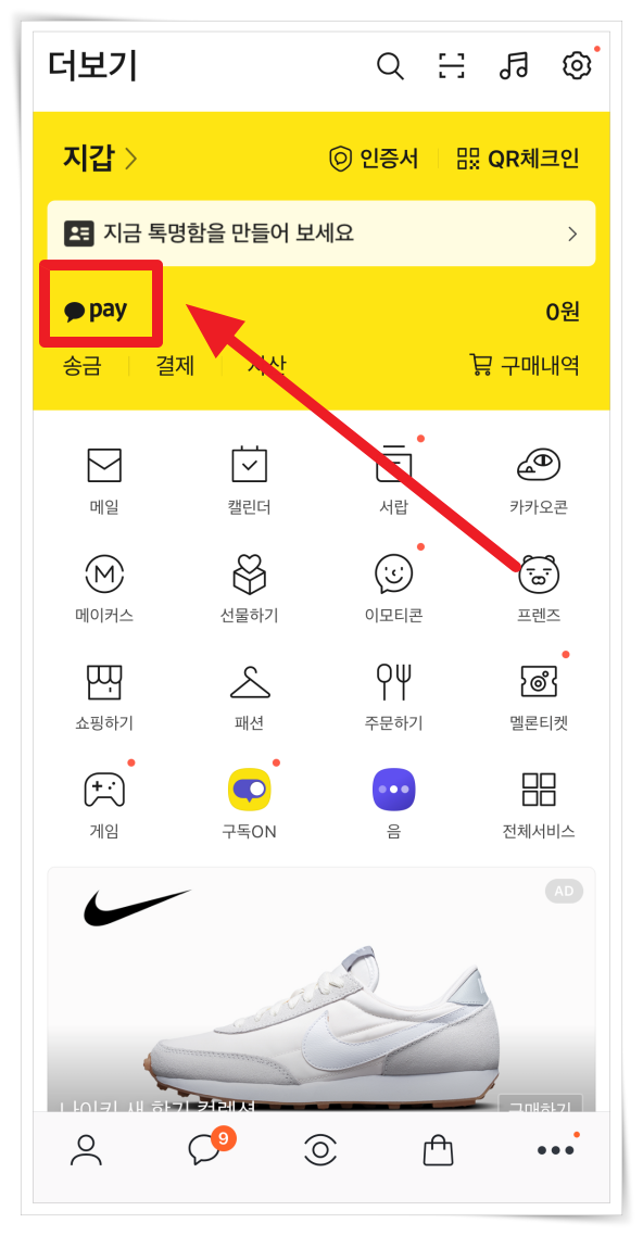 1. 카톡 우측 하단 "더보기" 탭에서 "PAY" 메뉴를 클릭해 주세요,