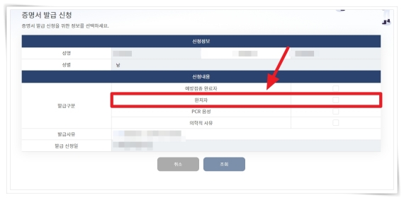 4. 증명서 발급 신청 "발급구분"을 "완치자"로 체크해 주세요.