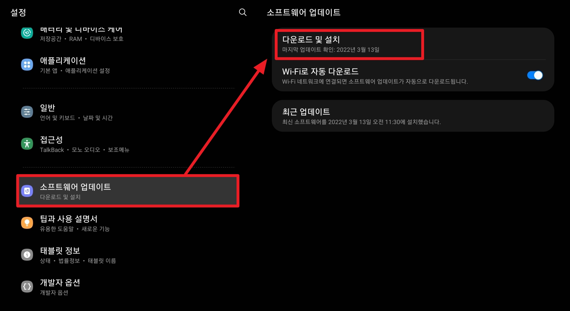 1. 이번 기능은 소프트웨어 업데이트를 해야 이용할 수 있습니다. 설정 > 소프트웨어 업데이트 > 다운로드 및 설치를 통해 업데이트를 진행해 주세요.
