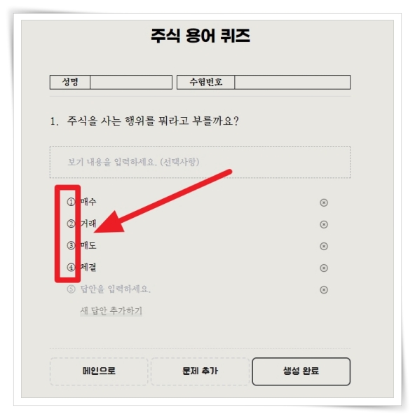 3. 답안을 입력 후 엔터를 치면 더 많은 답안을 작성할 수 있습니다. 삭제하려면 우측 X를 클릭하면 지울 수 있어요.