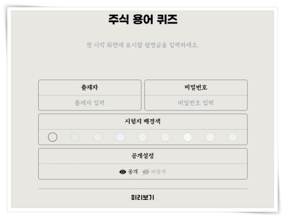 퀴즈를 만드는 방법은 회원가입이나 로그인 없이 이름과 비밀번호 설정하면 질문과 답안을 작성하실 수 있습니다.
