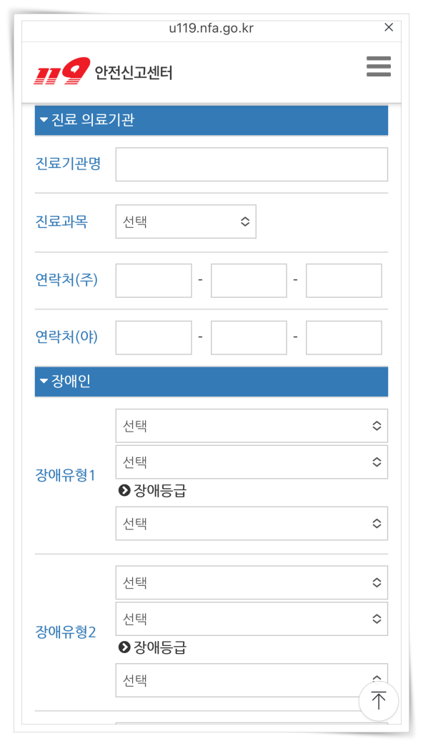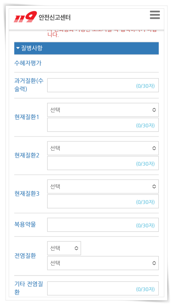 6. 마지막으로 신청자 인적사항, 질병사항, 진료기관을 입력하면 신청을 완료하실 수 있습니다.