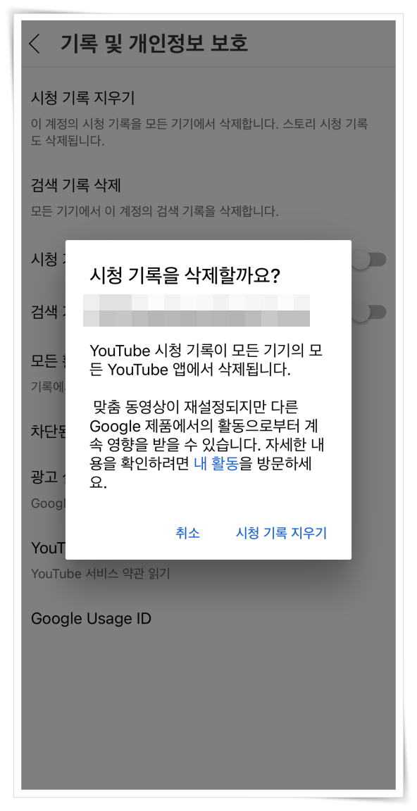 4. 시청 기록과 검색 기록을 삭제하면 맞춤 동영상이 재설정됩니다. 모든 기록을 삭제해 주세요.
