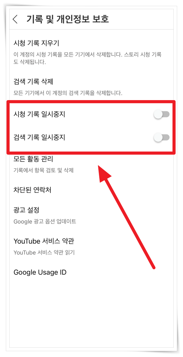 5. 시청 기록과 검색 일시 정지를 체크하면 시청한 동영상을 찾기 어려줘지고 추천 항목을 줄일 수 있다고 해요. 알고리즘 영향을 최대한 적게 받으려면 설정해 주세요.