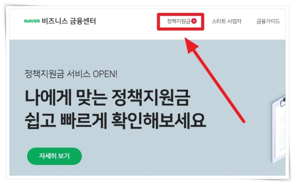 1. 홈페이지 상단 메뉴 "정책지원금"을 클릭해 주세요.