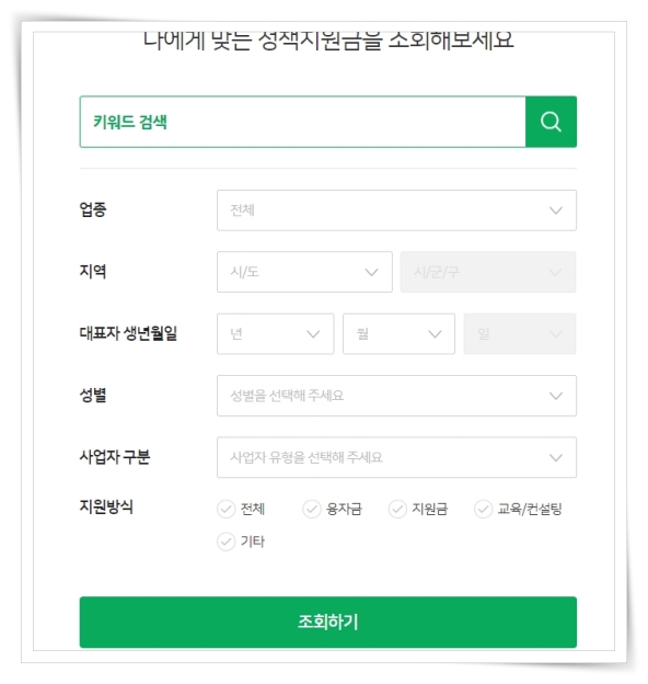 2. 업종, 지역, 대표자 생년월일, 성별, 사업자 구부, 지원방식을 입력해 주세요.