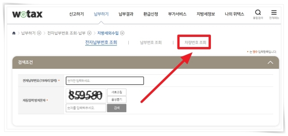 2. 메뉴에서 "차량번호 조회"를 클릭해 주세요.
