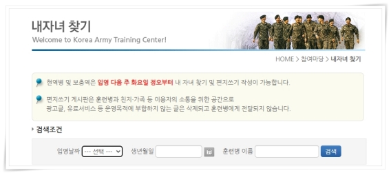 찾기 서비스는 입영 다음 주 화요일 정보부터 찾기 및 편지쓰기 작성이 가능합니다. 편지쓰기 게시판은 훈련병과 친지·가족 등 이용자의 소통을 위한 공간으로 광고글, 유료서비스 등 운영목적에 부합하지 않는 글은 삭제되고 훈련병에게 전달되지 않는다고 해요.