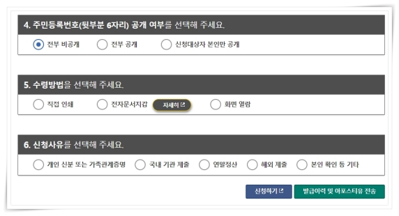 5. 주민등록번호 공개 여부, 수령 방법, 신청 사유를 입력해 주세요.